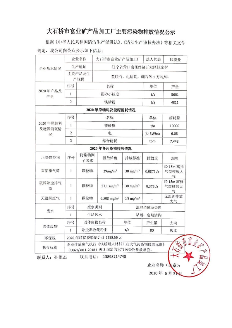 大石桥市富业矿产品加工厂主要污染物排放情况公示
