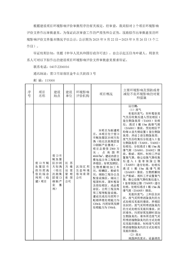 营口市生态环境局关于2025年9月22日拟作出的环境影响评价文件审批意见的公示