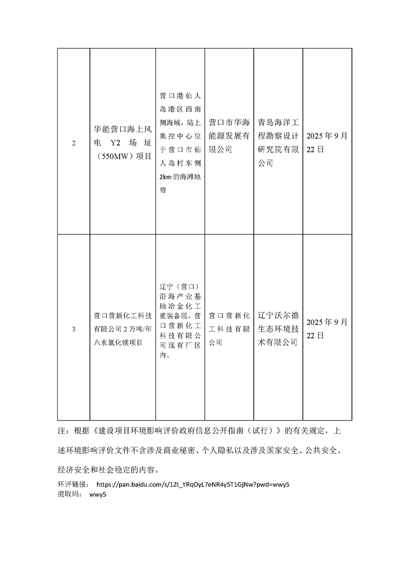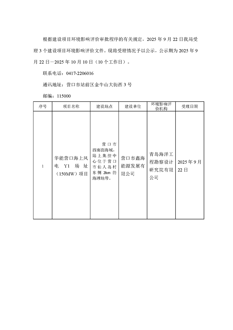 营口市生态环境局关于2025年9月22日建设项目环境影响评价文件受理情况的公示