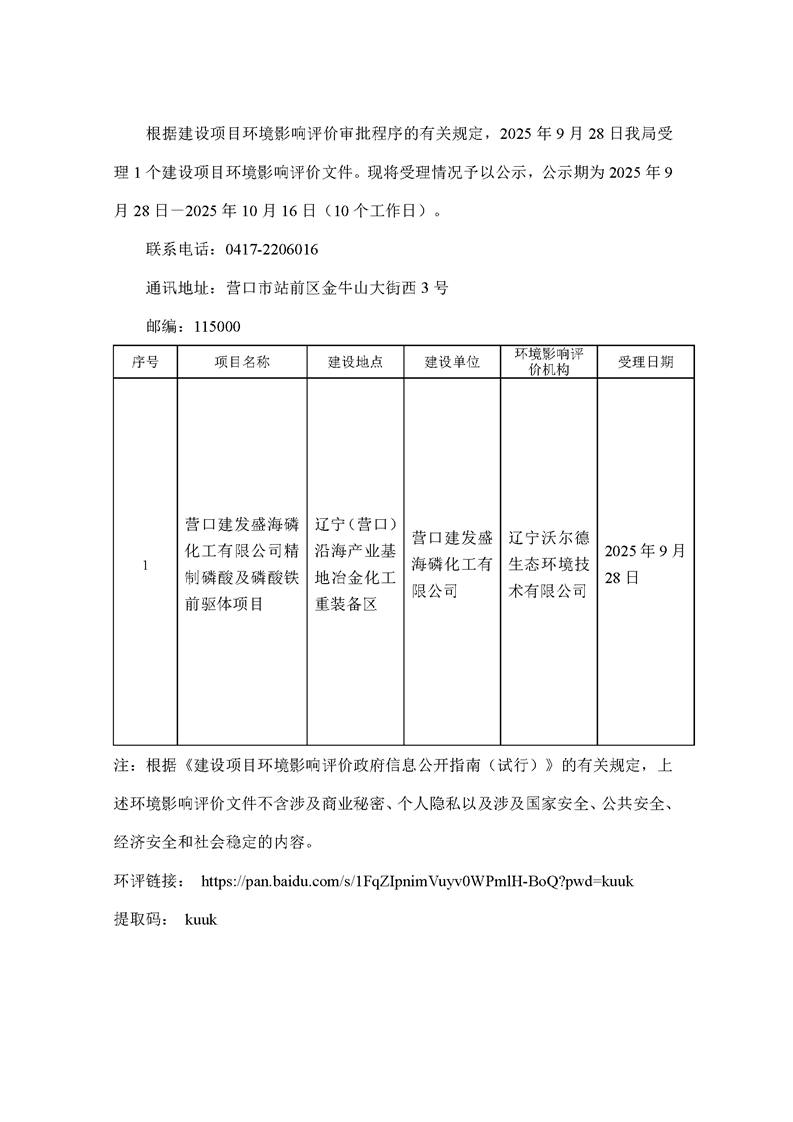 营口市生态环境局关于2025年9月28日建设项目环境影响评价文件受理情况的公示