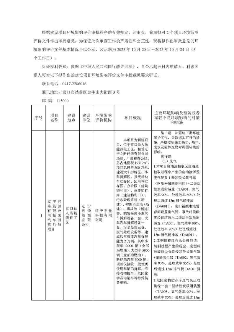 营口市生态环境局关于2025年10月20日拟作出的环境影响评价文件审批意见的公示