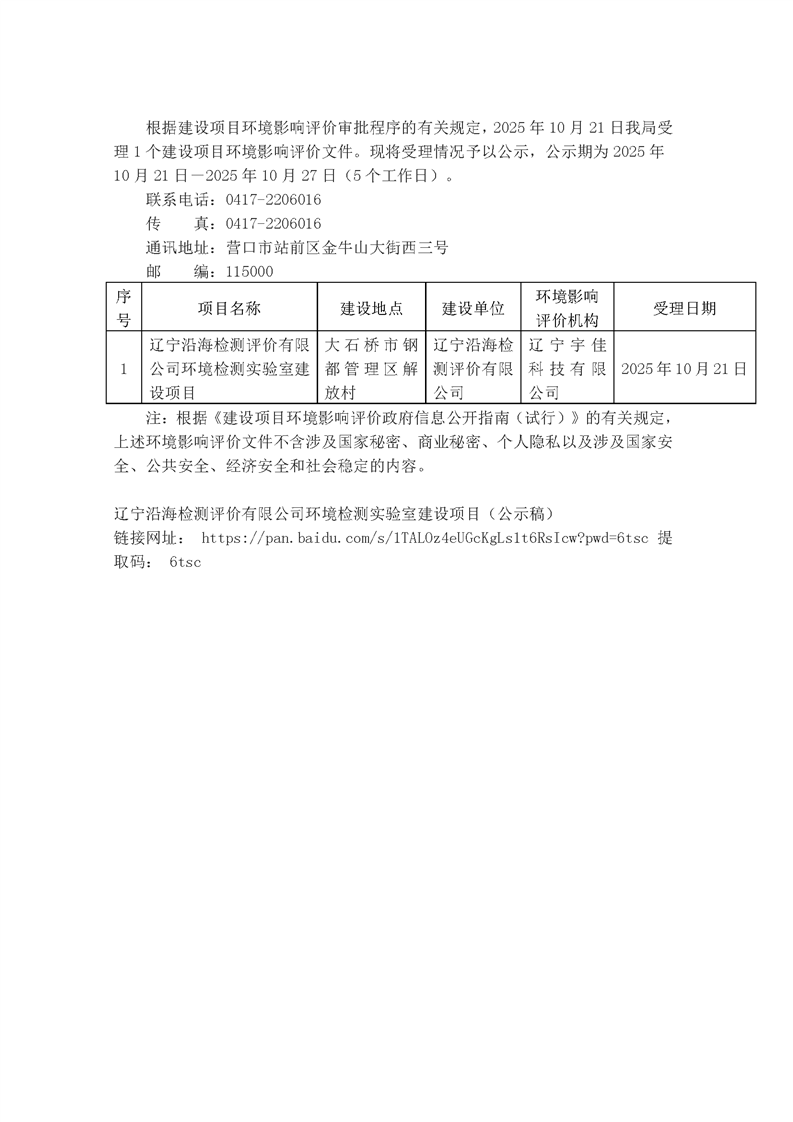 营口市生态环境局关于2025年10月21日建设项目环境影响评价文件受理情况的公示