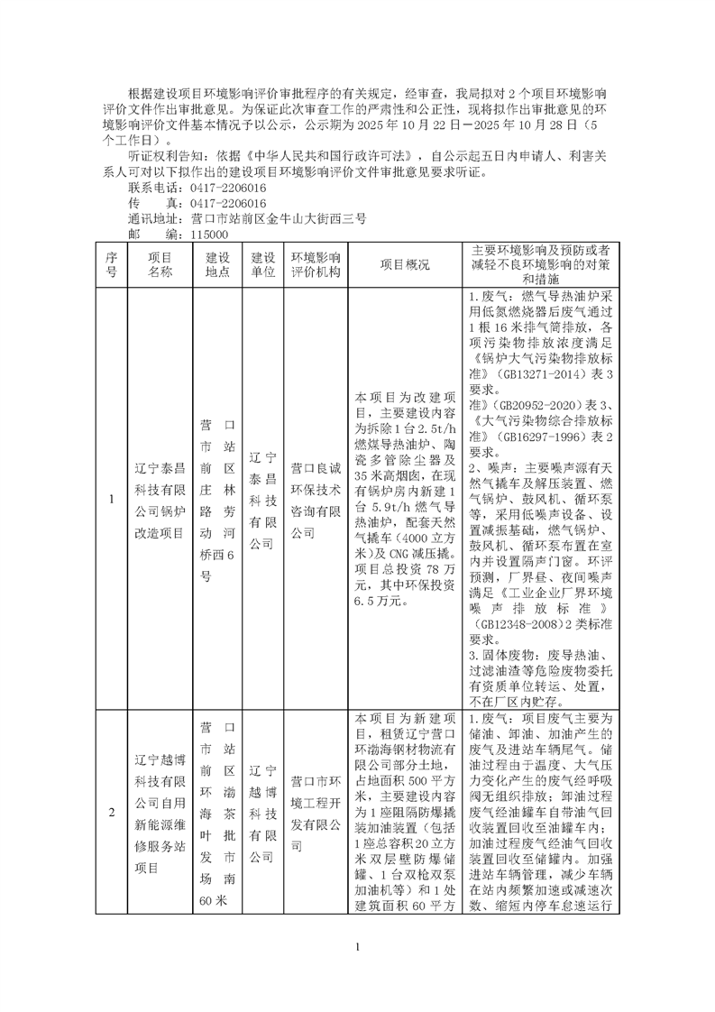 营口市生态环境局关于2025年10月22日拟作出的环境影响评价文件审批意见的公示