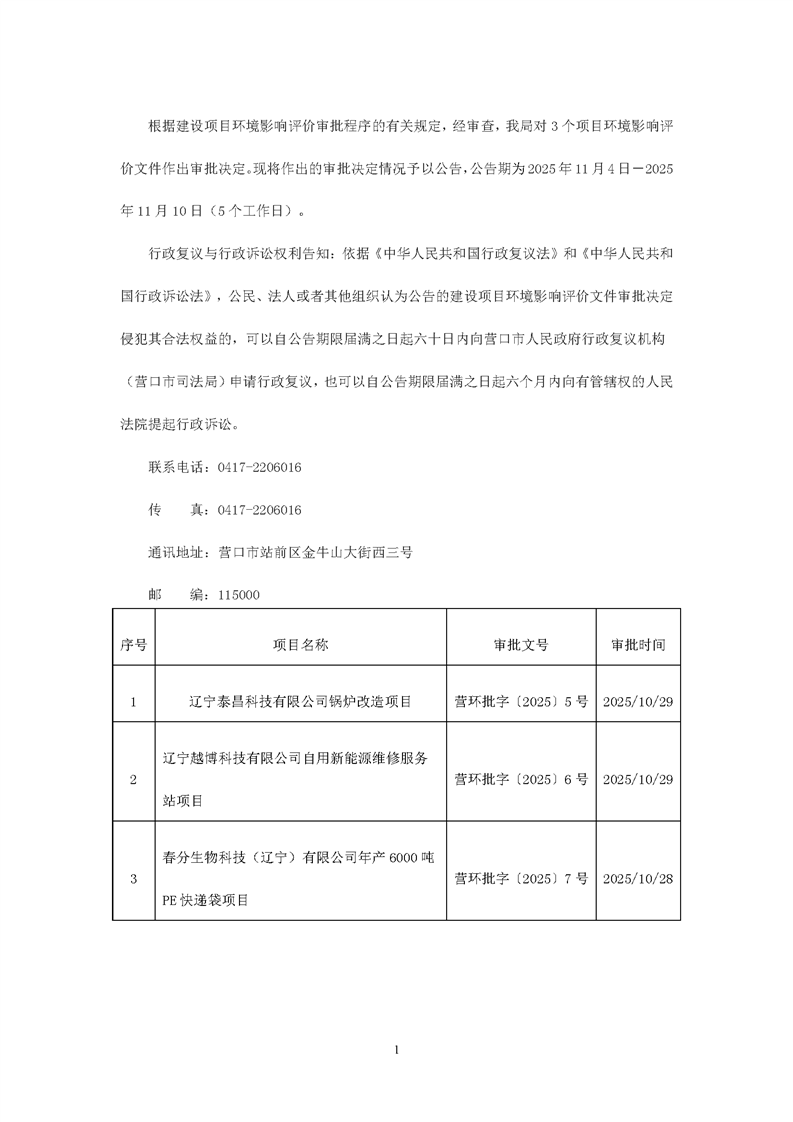 营口市生态环境局关于2025年11月4日作出环评文件审批决定的公告