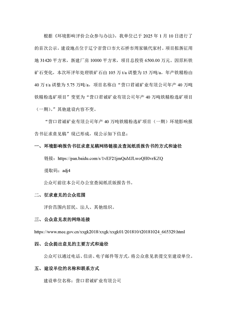 君诚矿业铁选厂-征求意见稿公示
