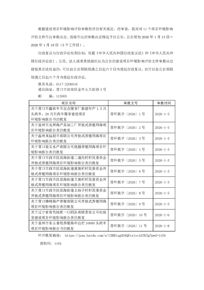 营口市生态环境局关于2026年1月13日作出环评文件审批决定的公告