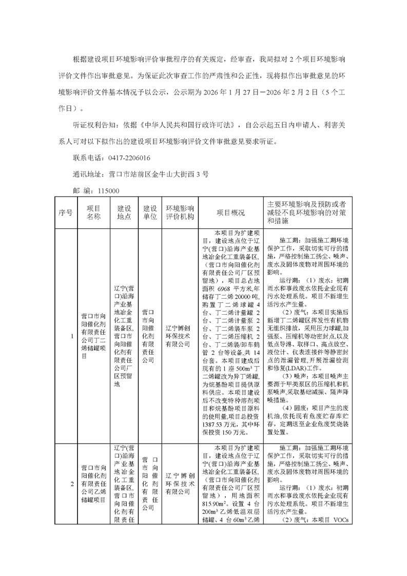 营口市生态环境局关于2026年1月27日拟作出的环境影响评价文件审批意见的公示