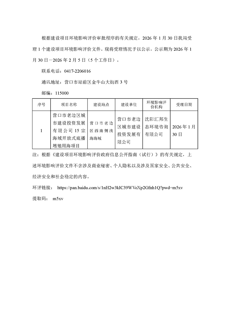营口市生态环境局关于2026年1月30日建设项目环境影响评价文件受理情况的公示