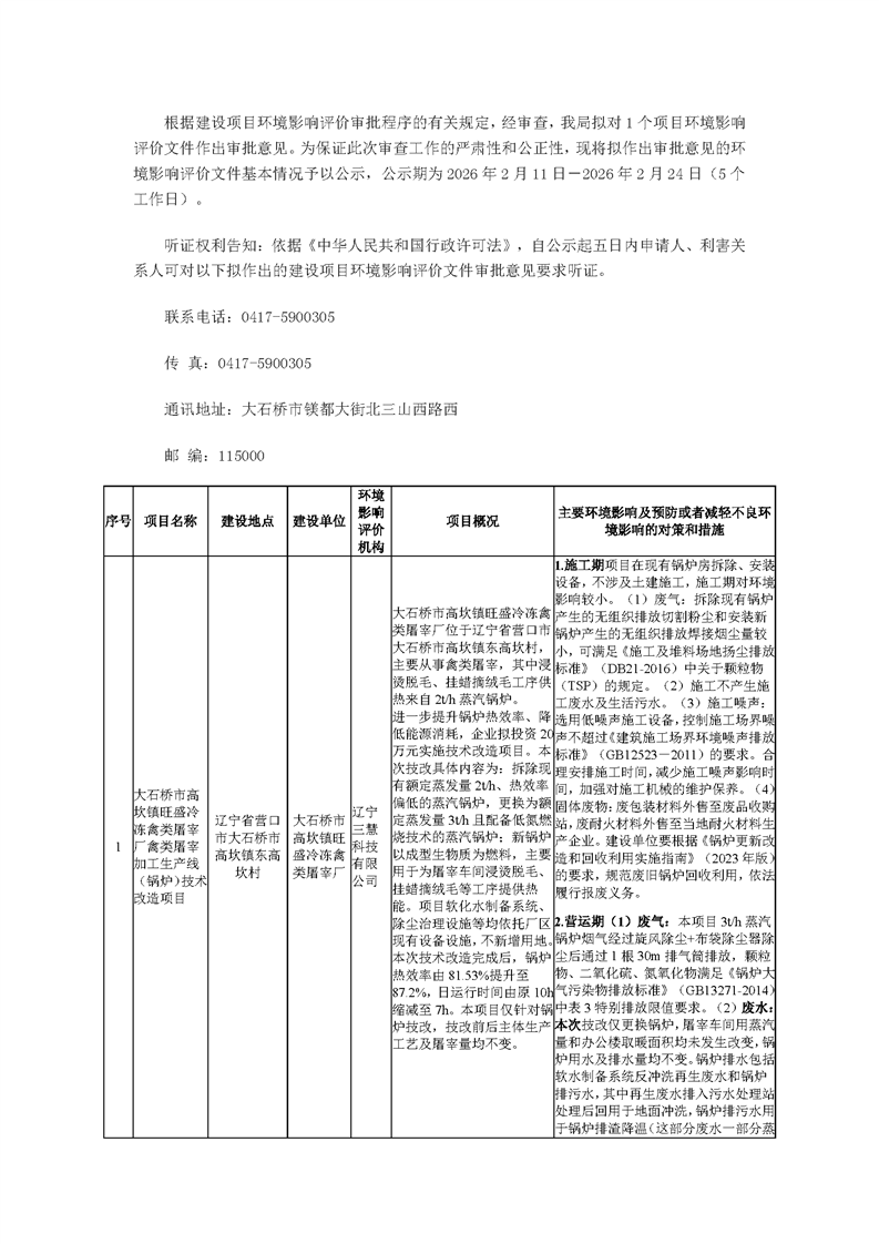 营口市大石桥生态环境分局关于2026年2月11日拟作出的环境影响评价文件审批意见的公示