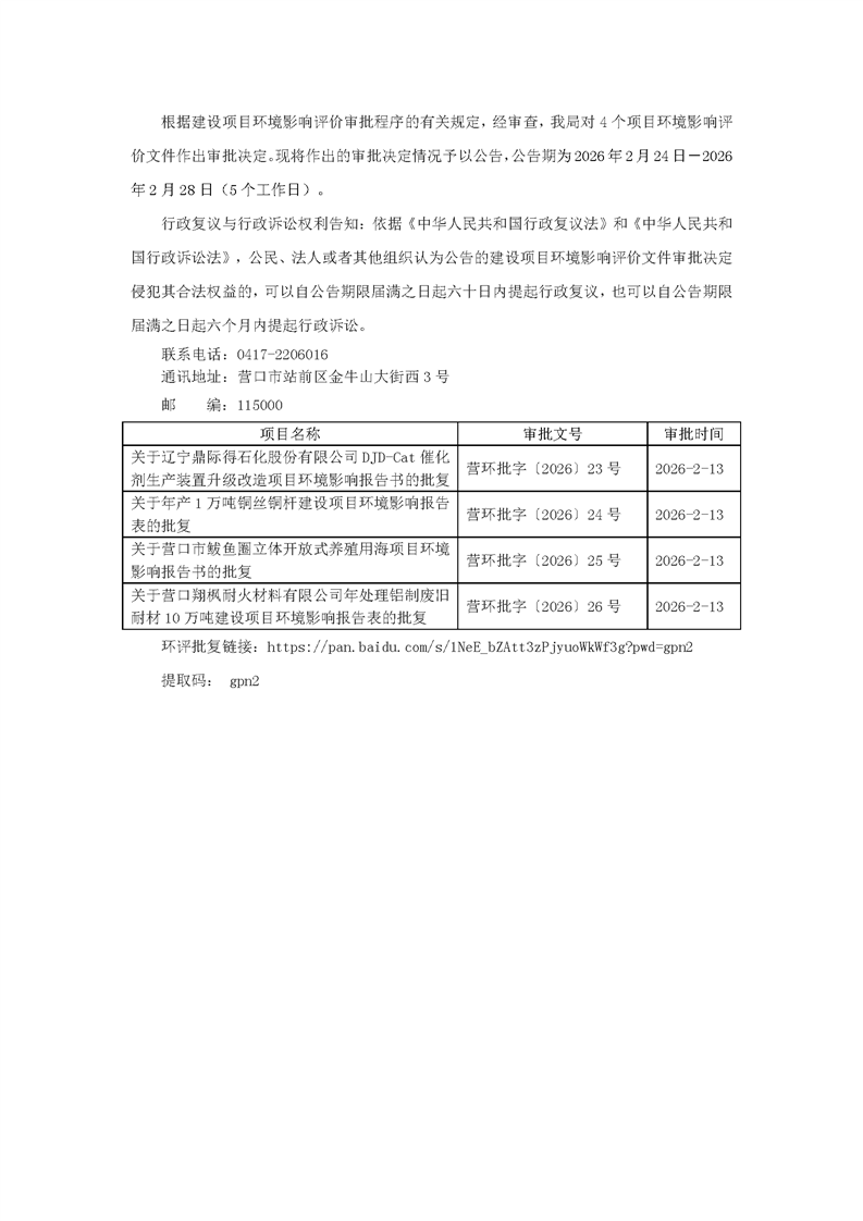 营口市生态环境局关于2026年2月24日作出环评文件审批决定的公告