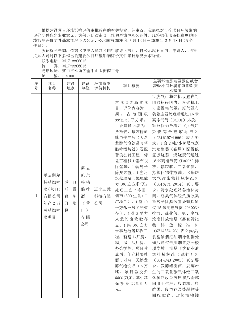 营口市生态环境局关于2026年3月12日拟作出的环境影响评价文件审批意见的公示