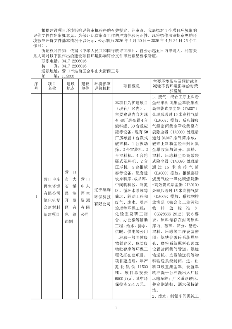 营口市生态环境局关于2026年4月20日拟作出的环境影响评价文件审批意见的公示