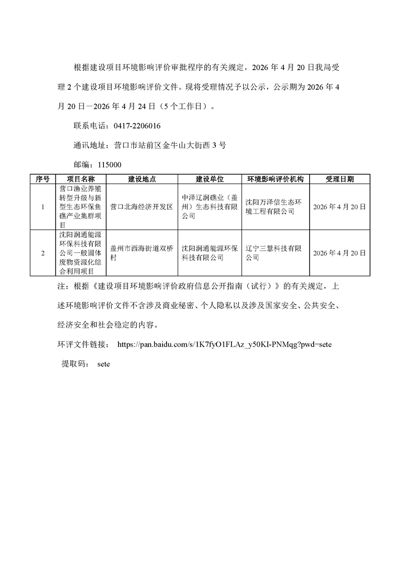 营口市生态环境局关于2026年4月20日建设项目环境影响评价文件受理情况的公示