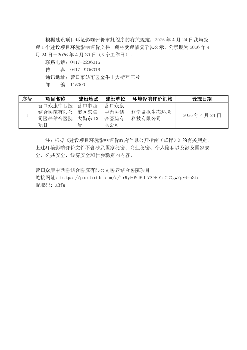 营口市生态环境局关于2026年4月24日建设项目环境影响评价文件受理情况的公示