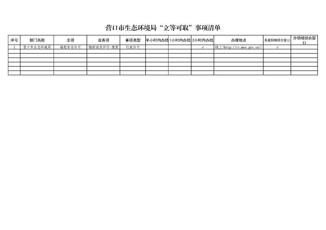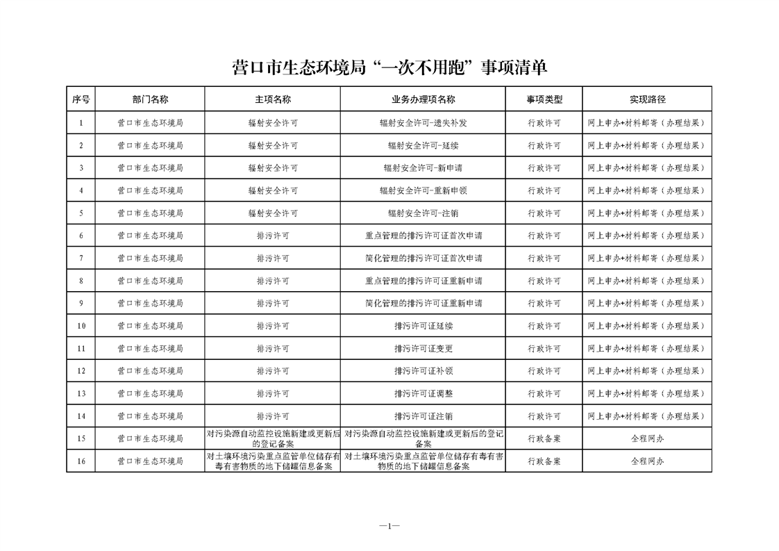 营口市生态环境局“一次不用跑”“立等可取”事项清单
