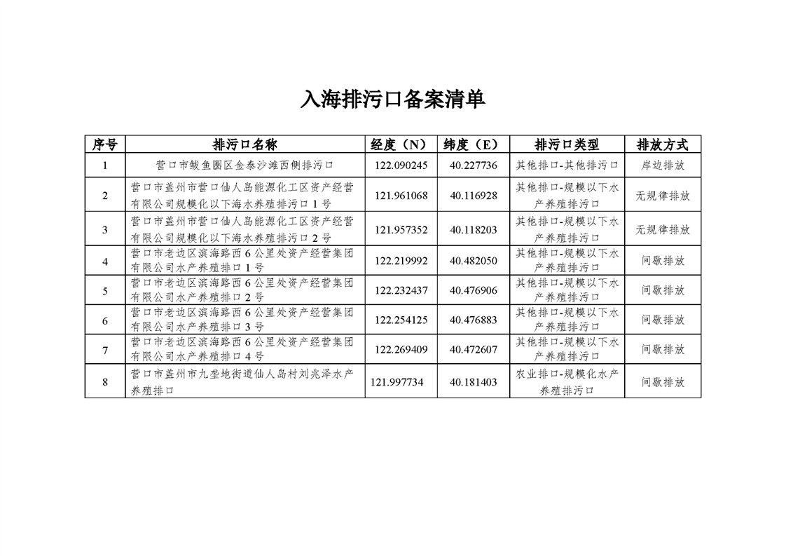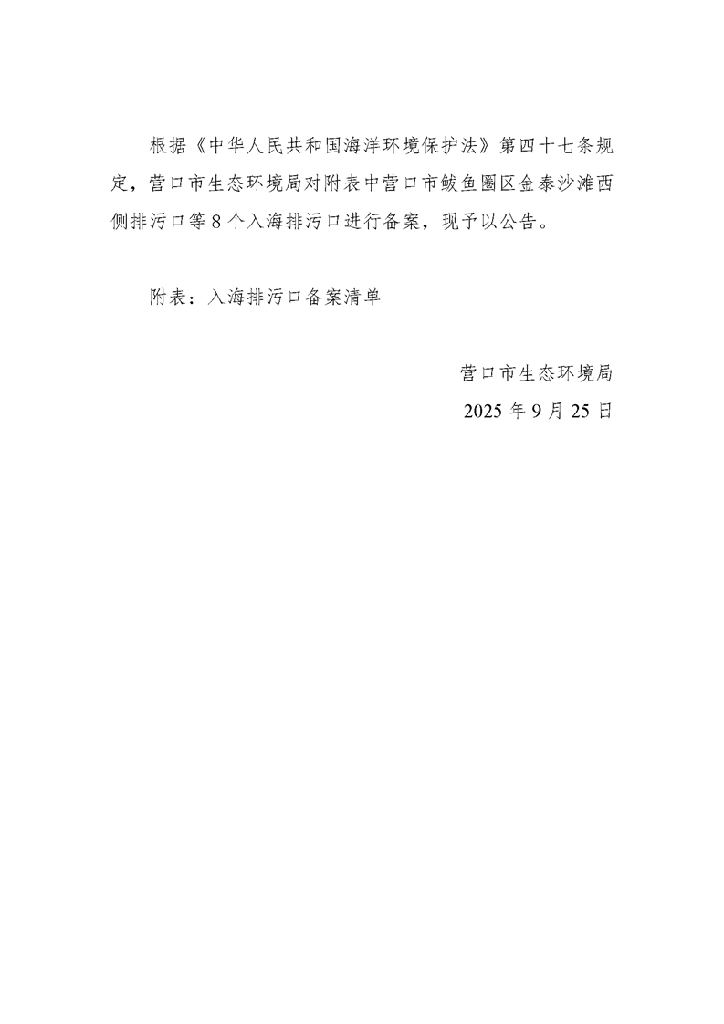 关于营口市鲅鱼圈区金泰沙滩西侧排污口等8个入海排污口备案的公告