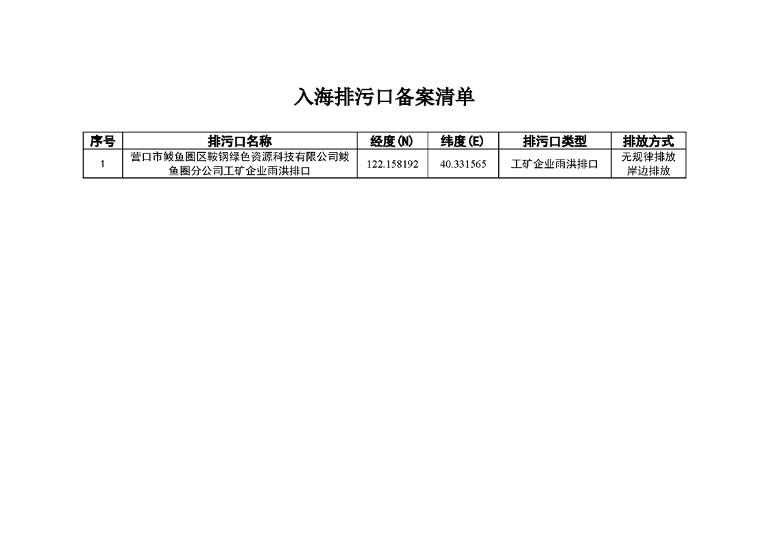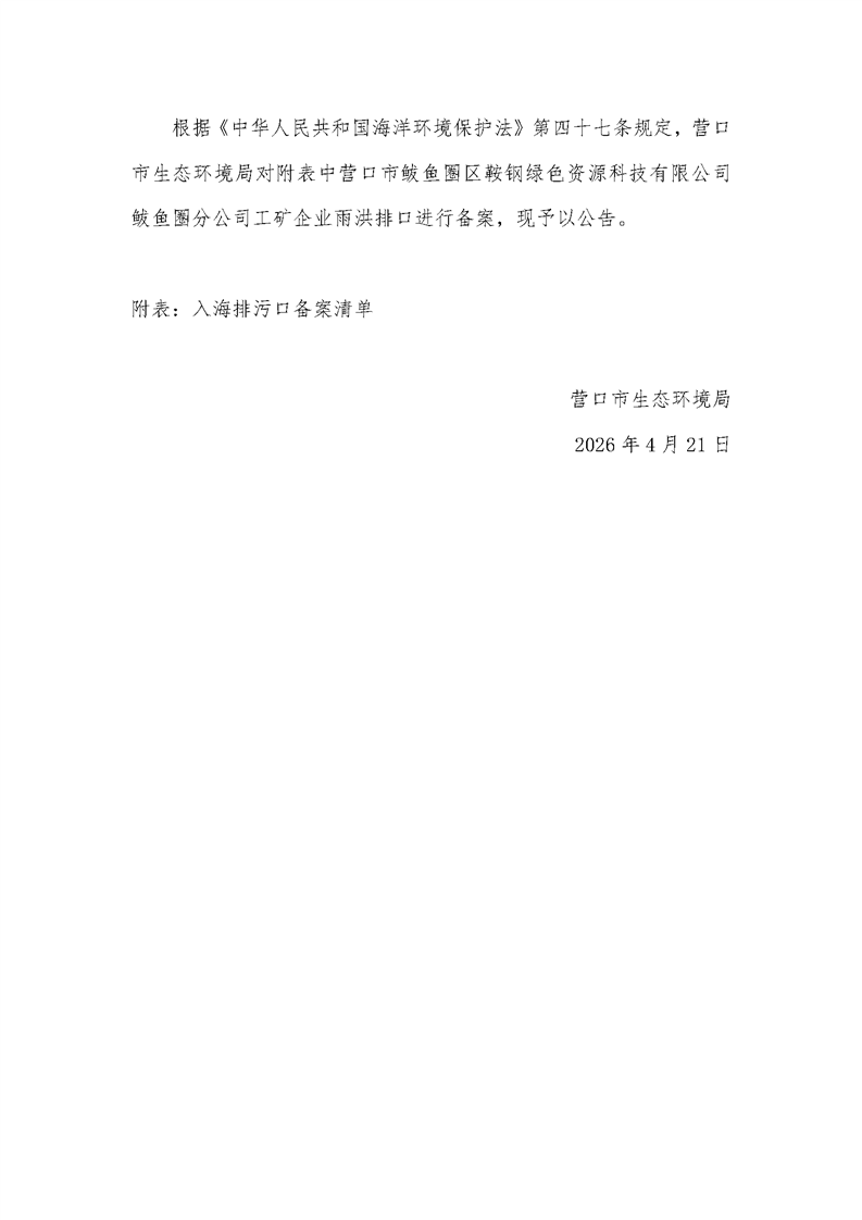 关于营口市鲅鱼圈区鞍钢绿色资源科技有限公司鲅鱼圈分公司工矿企业雨洪排口首次备案的公告