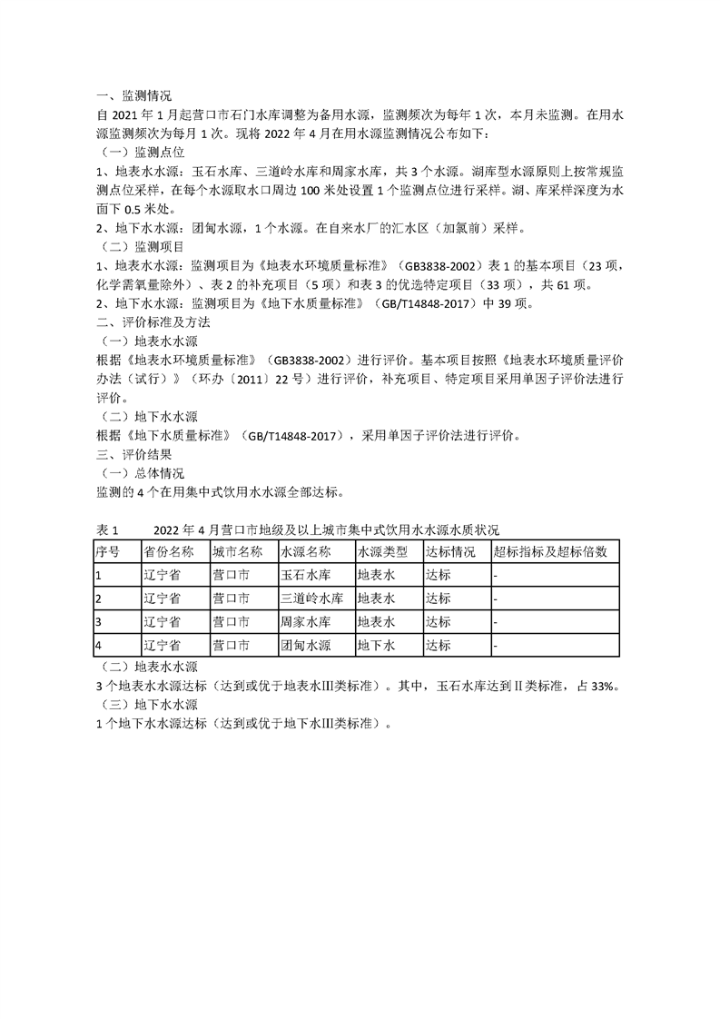 营口市2022年4月集中式生活饮用水水源水质状况