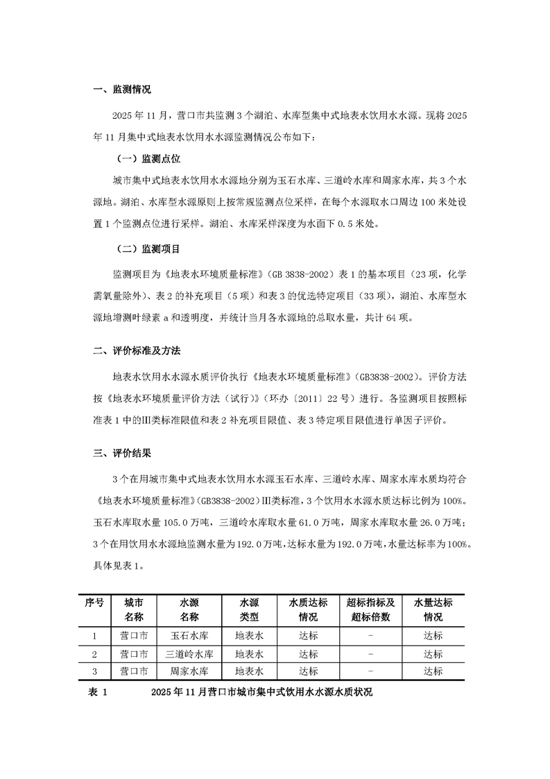 营口市2025年11月城市集中式饮用水水源水质状况