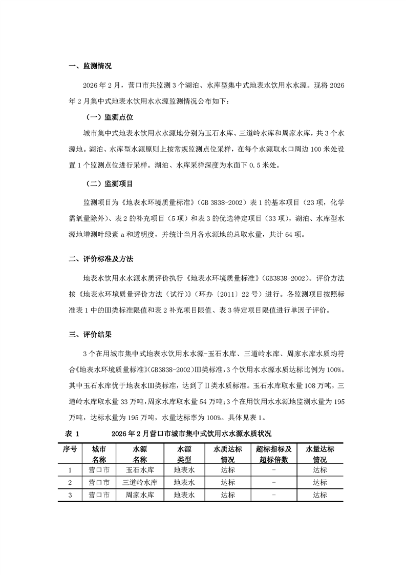 营口市2026年2月城市集中式饮用水水源水质状况