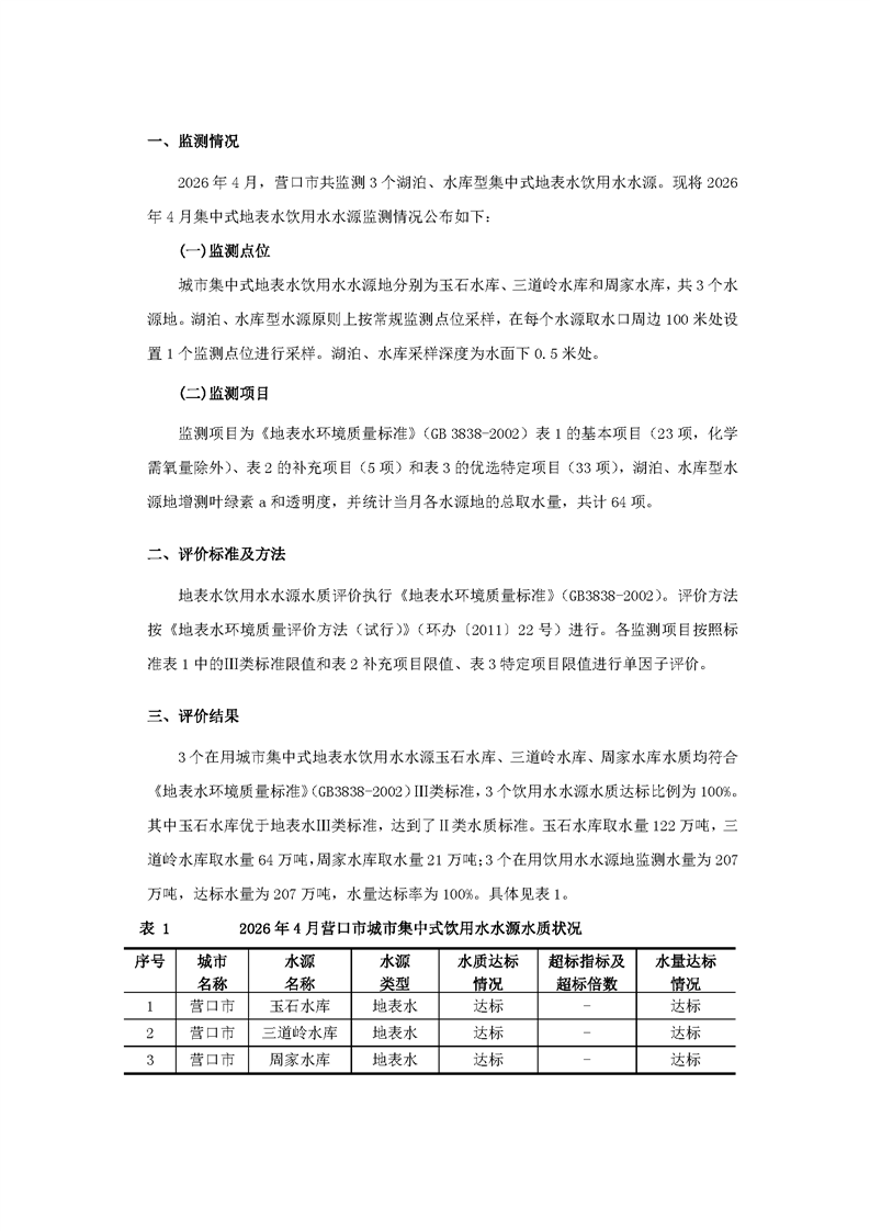 营口市2026年4月城市集中式饮用水水源水质状况