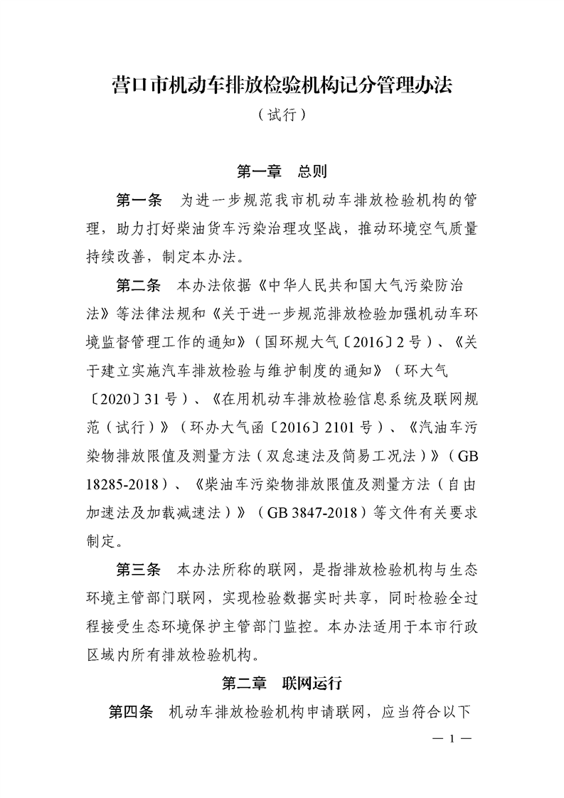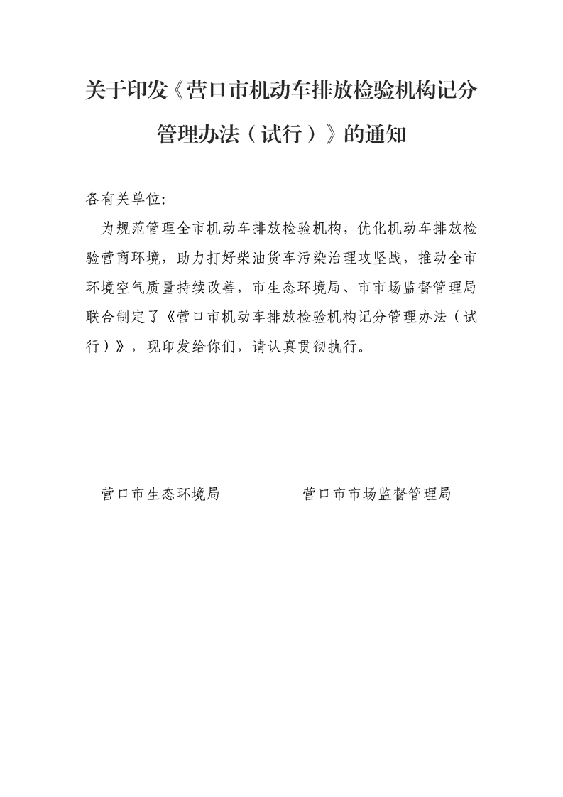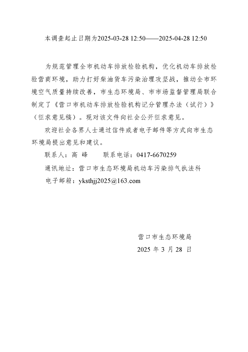 【征集中】关于《营口市机动车排放检验机构记分管理办法(试行)》的通知(征求意见稿)公开征求意见的公告